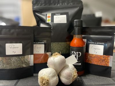 Légumes variés, Ail 'Music', Piments forts, Gingembre frais, Fleurs coupées, Viande de nos porcs, Oeufs, Sirop d'érable, Poterie/Artisanat et des Produits Transformés cultivés et emballés par
